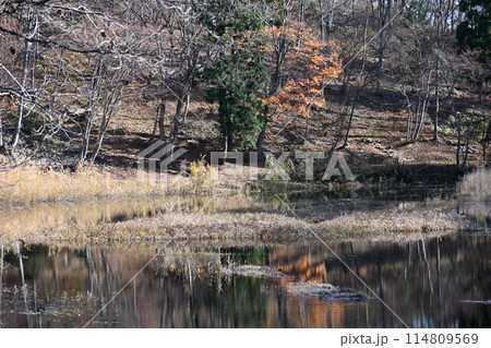 周りの木の葉が落ちている中でまだ辛うじて紅葉がある木が生えている西向沼の風景