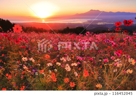 【長崎県】朝日に照らされた白木峰高原の満開のコスモスと雲仙岳