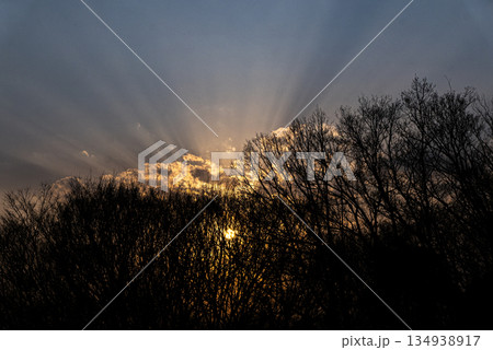 東京都立桜が丘公園の林のシルエットと夕日の光芒の写真