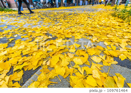 日本の横浜都市景観 師走…美しい黄色の絨毯だが、滑りやすので注意が必要…=横浜市のセンター北駅前で