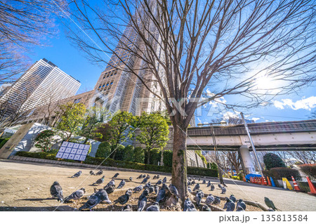 日本の東京都市景観 都庁前駅…日光浴をするハトの群れ…人が通っても逃げない…=令和8年1月25日
