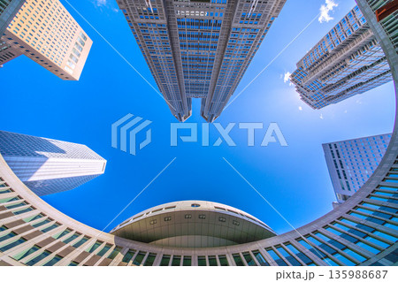 日本の東京都市景観8月5日。猛烈な暑さ…東京都庁やオフィスビル群などを望む…新時代へ、希望の光…