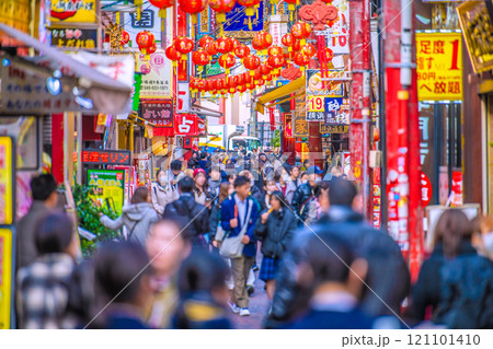 日本の横浜都市景観 横浜中華街・中学生などの団体旅行客らで賑わう市場通りなどを望む…