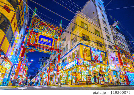 日本の横浜都市景観 新風景。年の瀬。夜の北京小路から横浜中華街・市場通りなどを望む