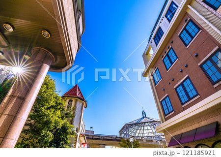 日本の横浜都市景観 年の瀬…横浜市営地下鉄 中川駅などを望む。夕日に照らされる幸福の形…新時代へ