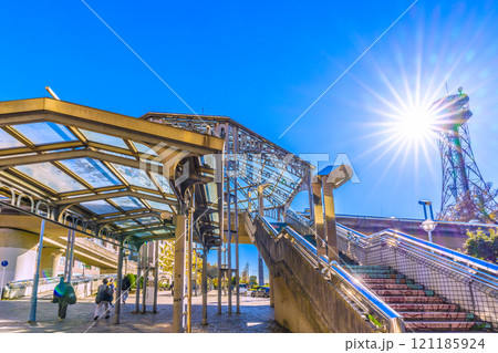 日本の横浜都市景観 年の瀬…横浜市営地下鉄 中川駅など望む。歩道橋に降りそそぐ太陽光…=16日