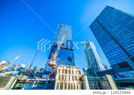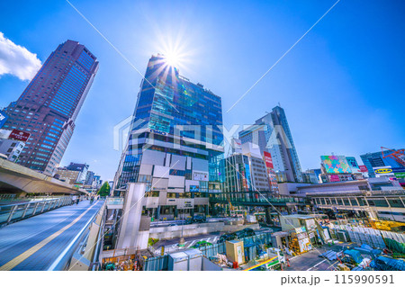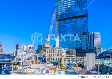 日本の東京都市景観 5月。渋谷駅再開発やビル群、大型クレーンなどを望む。希望の光=3日