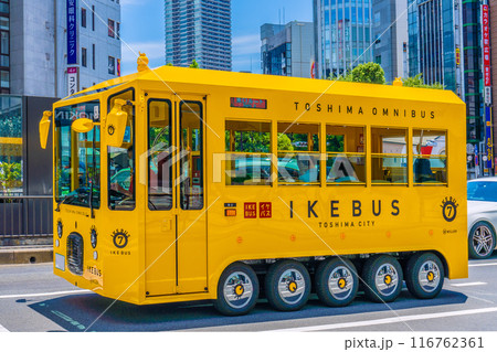 日本の東京都市景観 池袋駅東口。右奥に黄色いイケバスが見える