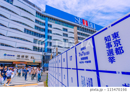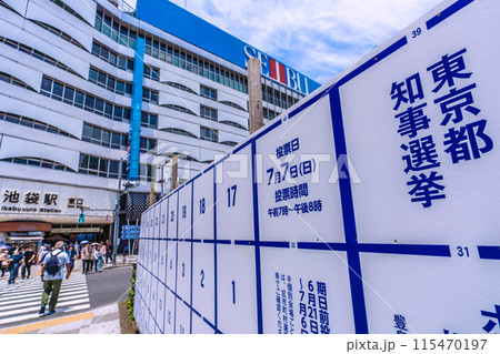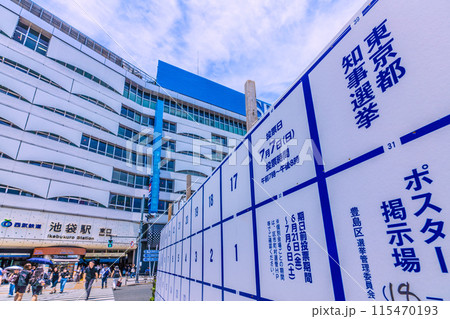 日本の東京都市景観 池袋駅東口。東京都知事選挙の選挙ポスター掲示場・2024年7月7日投票日