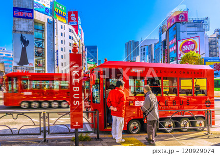 日本の東京都市景観 幸せを運ぶ黄色のイケバスなどを望む。まもなく発車…=12日、池袋駅東口