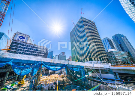 日本の東京都市景観1月25日。KEIO新宿駅や西新宿一丁目地区プロジェクト、クレーンなどを望む