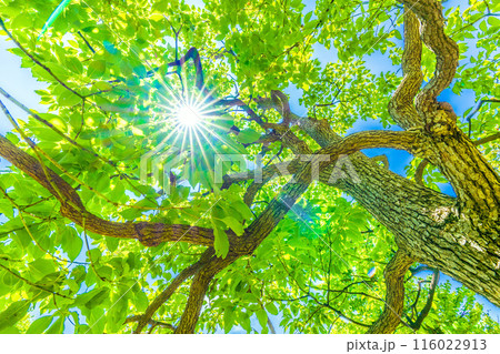日本の横浜都市景観 青空…太陽光が差し込むクスノキ。希望の光…。花言葉は芳香=5日、横浜市内