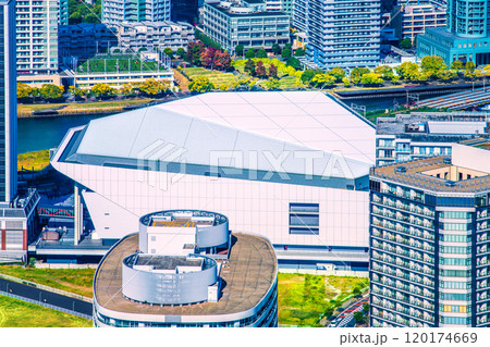 日本の横浜都市景観 連節バス(画面手前)やKアリーナ、新高島駅周辺などを望む=13日
