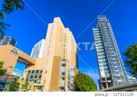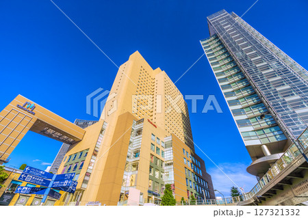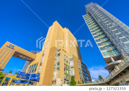 日本の横浜都市景観 桜木町駅 新南口(市役所口)や横浜ランドマークタワー、横浜市役所などを望む