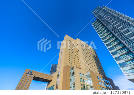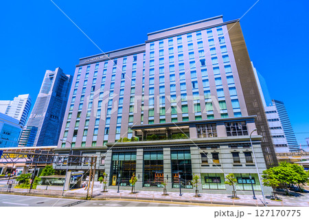 日本の横浜都市景観 6月。桜木町駅前から横浜桜木町ワシントンホテルや富士ソフトなどを望む