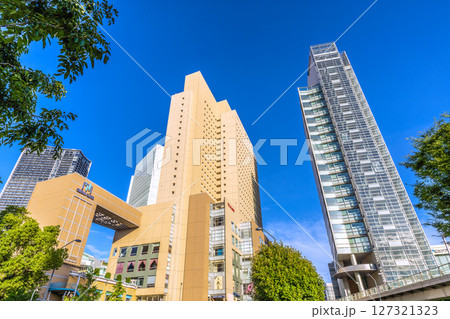 日本の横浜都市景観 横浜ランドマークタワーやホテルメッツ、桜木町駅 新南口(市役所口)などを望む