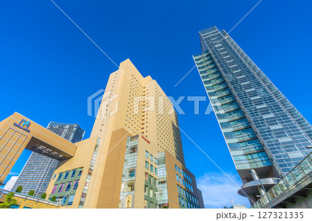日本の横浜都市景観 6月。桜木町駅前から横浜桜木町ワシントンホテルや横浜市役所、富士ソフトなどを望む