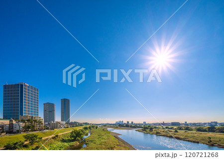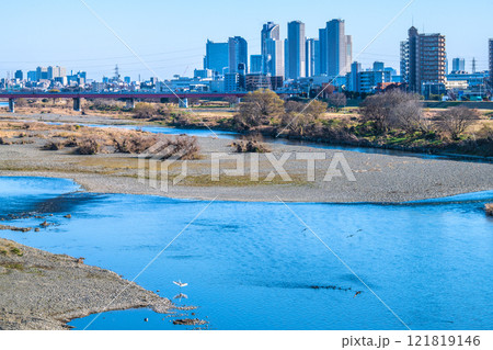 日本の東京都市景観 年の瀬。多摩川や武蔵小杉駅前のタワーマンション群などを望む。冬晴れ…=17日