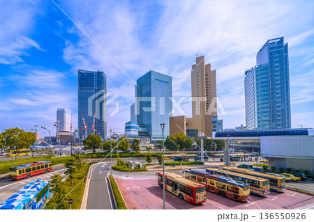 日本の横浜都市景観 桜木町駅前・横浜市役所や横浜ランドマークタワーなどビル群を望む