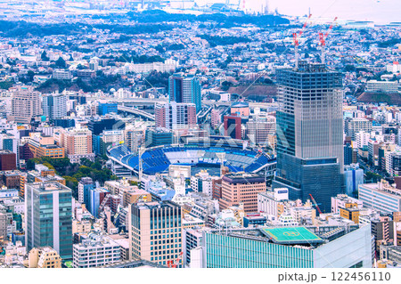 日本の横浜都市景観 新時代へ…横浜スタジアムなどを望む。希望の光…=令和7年1月22日