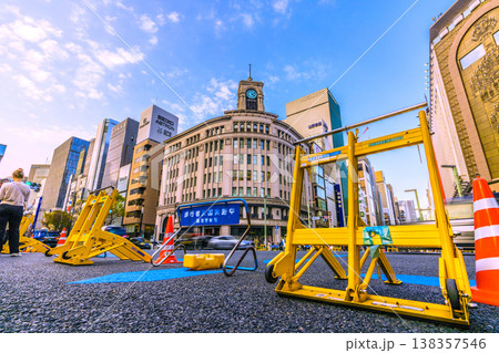 日本の東京都市景観インバウンド続く銀座。賑わう銀座4丁目交差点。奥は解体が進んだ三愛ドリームセンター