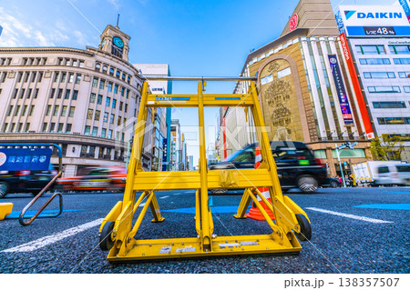 日本の東京都市景観3月28日。外国人観光客らで賑わう銀座のホコ天に車両強制停止装置