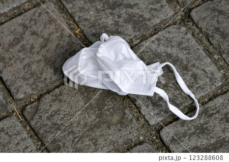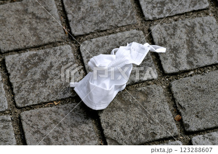 日本の横浜都市景観 街中で、ポイ捨てマスク(マスクの落とし物)が増加、ぺたんこに…=24日、横浜市内