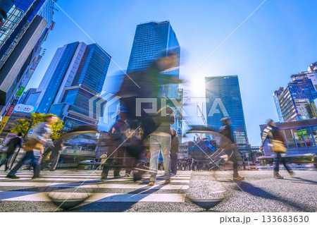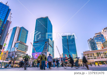 日本の東京都市景観 立ち往生するタクシー、なぜ…。インバウンドに沸く渋谷。渋谷駅再開発も進む=21日