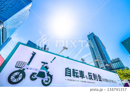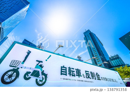 日本の東京都市景観青切符制度4月1日スタート。「自転車も反則金の対象となりました。」の看板登場=渋谷