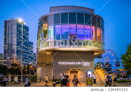 日本の東京都市景観 早朝の桜木町駅前やランドマークタワー、エアキャビンの桜木町駅など=4月26日