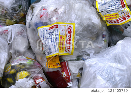 日本の横浜都市景観 5月。プラスチック製容器包装の収集日。街中で見かけた山積みになっているゴミ集積場
