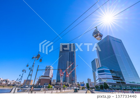 日本の東京都市景観 桜木町駅前。YOKOHAMA AIR CABIN桜木町駅やビル群などを望む