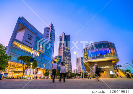 日本の東京都市景観 桜木町駅前のビル群や帆船日本丸などを望む