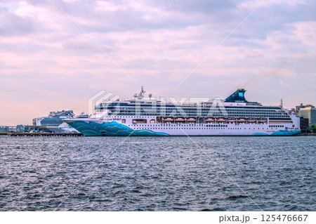 日本の横浜都市景観2隻の豪華客船。ノルウェージャン・スピリットやクイーン…、ぷかりさん橋などを望む