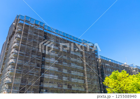 日本の横浜都市景観 マンションの補修や点検等、足場や防護ネットなど。ネットの外に衛星アンテナが…