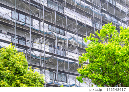 日本の横浜都市景観 マンションの補修や点検等のため組まれた足場や防護ネットなどを望む=横浜市内