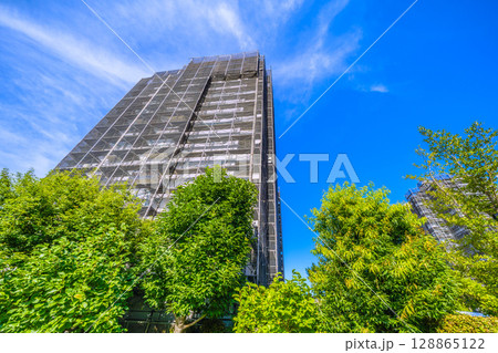 日本の横浜都市景観 夏空が広がる…マンションの補修や点検等、足場や防護ネットなどを望む