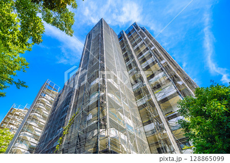 日本の横浜都市景観 マンションの補修や点検等、足場や防護ネットなどを望む。衛星アンテナが…