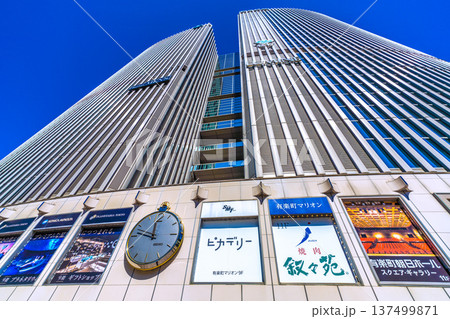 日本の東京都市景観3月8日。数寄屋橋交差点前の有楽町マリオンなどを望む