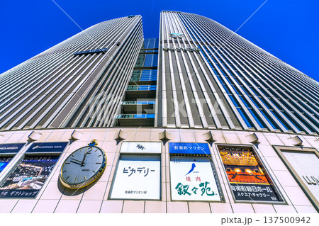 日本の東京都市景観新幹線(左下)や数寄屋橋交差点前の有楽町マリオンなどを望む