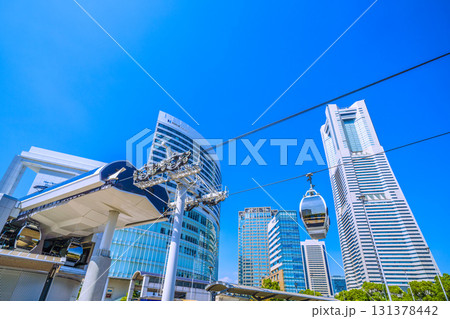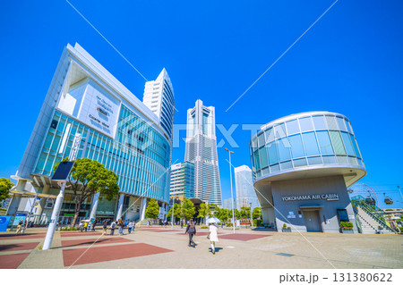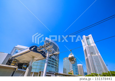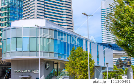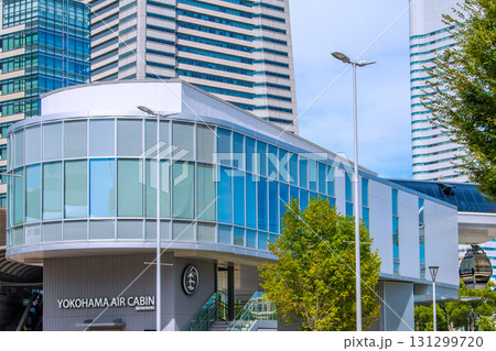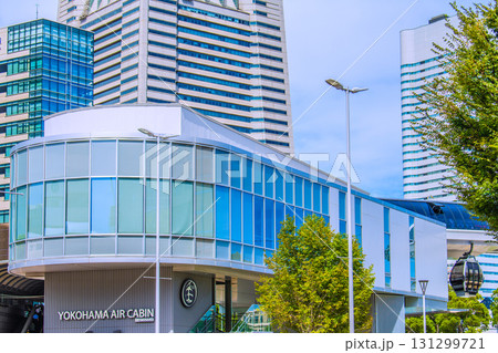 日本の横浜都市景観9月25日。ヨコハマエアキャビンの桜木町駅や横浜ランドマークタワーなどを望む