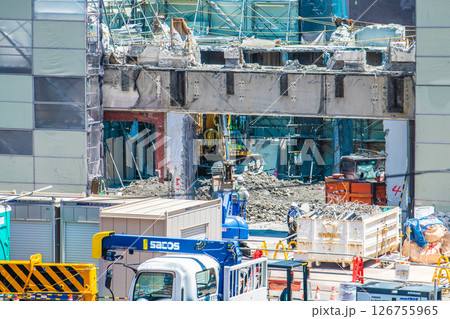 日本の東京都市景観5月20日。さよなら渋谷駅西口。閉鎖されたビルの解体進む(画面奥は出入口新通路)…
