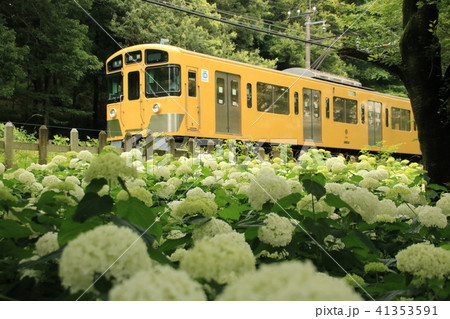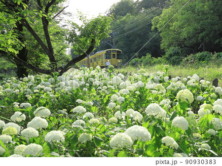 白いあじさいと黄色い西武鉄道の電車