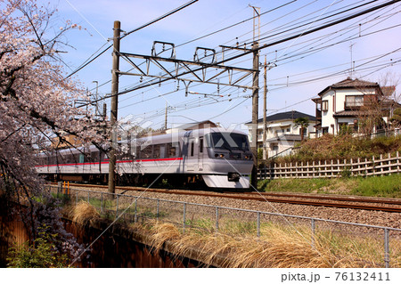 武蔵関駅付近の桜並木を通過する西武線の特急列車(2)