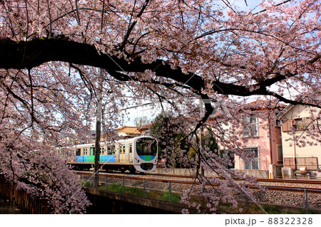 石神井川沿いにある春の桜並木を通過する特急小江戸(2)