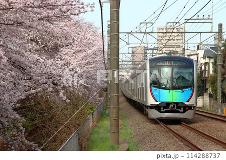 春の石神井川桜並木を行く西武新宿線40000系電車(東京都練馬区)