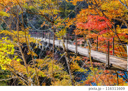 秋の山梨県山梨市 紅葉の西沢渓谷 西沢大橋
