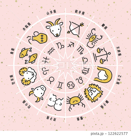 占星術に使われる黄道12星座のホロスコープを描いたイラスト シンプルな手描きシンボルマークと星座線
