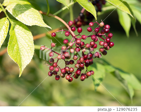 セイヨウアカミニワトコの蕾と枝葉(自然環境下マクロ撮影)