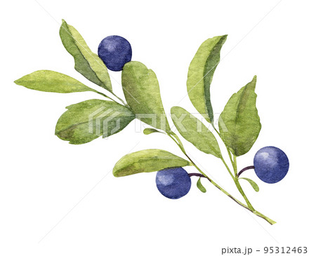 Watercolour blueberry twig with berries, leaves hand drawn isolated on white. Huckleberry on twigs with green leaves and dark blue berries (bilberry, whortleberry, blueberry, hurtleberry, blueberry)